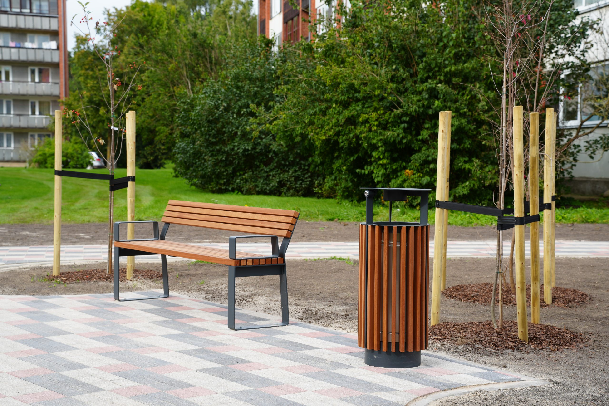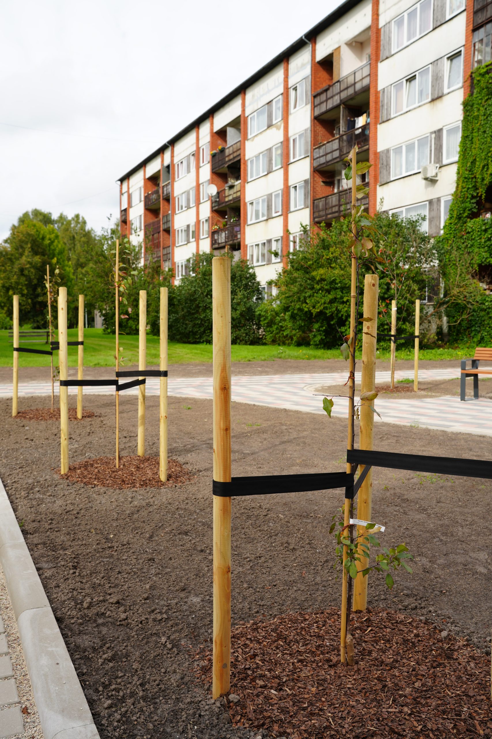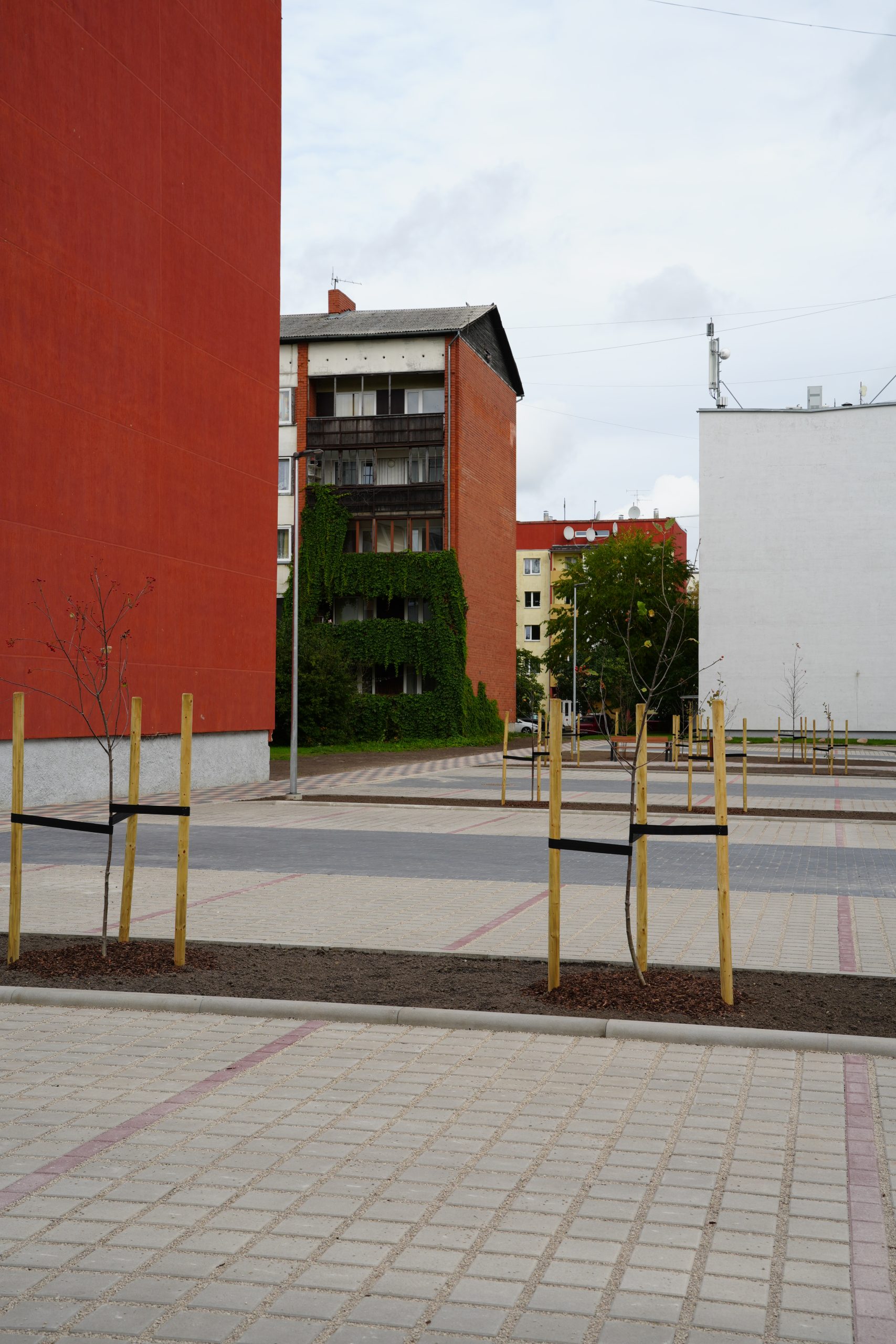 Stāvvietas un gājēju celiņi izbūvēti atbilstoši Vienotas Kuldīgas pilsētas daudzstāvu daudzdzīvokļu māju mikrorajonu pagalmu pilsētvides atjaunošanas, pārbūves un attīstības koncepcijai.