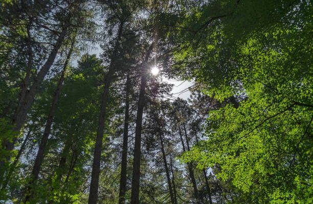 The crown of group diverse trees and sky with sun in springtime, Vitosha mountain, Bulgaria